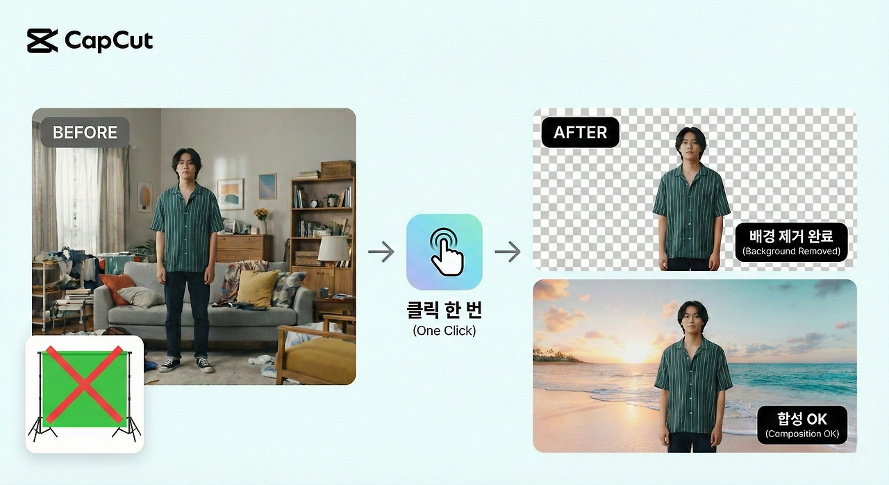 ✂️ 스마트 컷아웃: 크로마키 천 없이도 OK. 클릭 한 번으로 인물 뒤의 배경을 싹 지우고 합성할 수 있습니다.