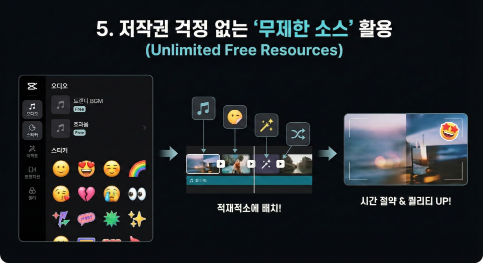 5. 저작권 걱정 없는 '무제한 소스' 활용 🎵 BGM, 효과음, 스티커 찾느라 시간 낭비하지 마세요.
