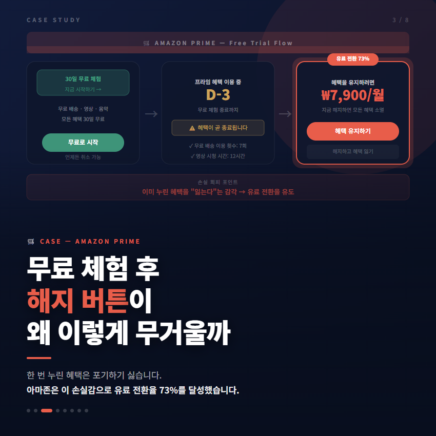 한 번 내 것이 된 혜택은 포기하기 싫은 법이죠. 아마존은 이 손실감으로 무려 73%의 유료 전환율을 만들어냅니다.