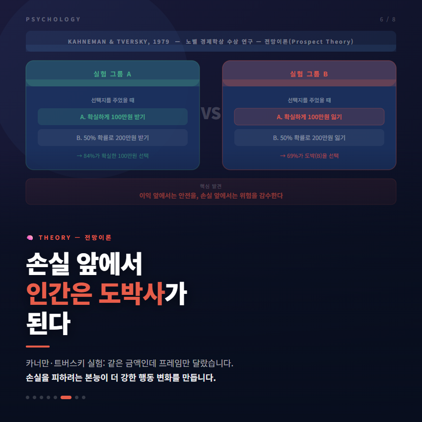 사람들은 이익 앞에서는 안전한 선택을 하지만, 손실 앞에서는 위험을 기꺼이 감수하려는 본능이 있습니다.