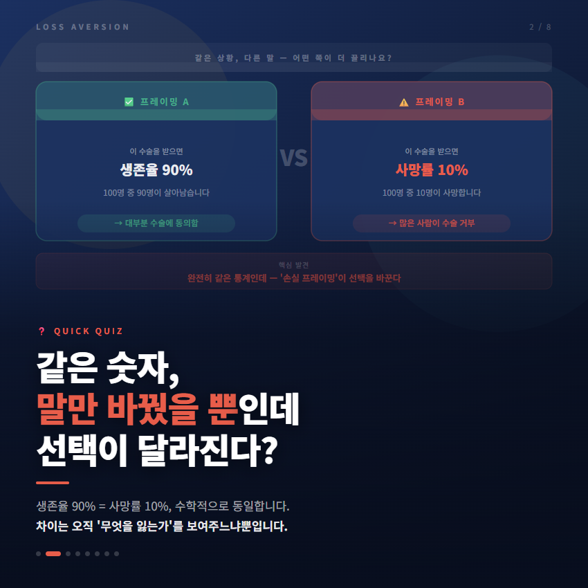 이처럼 완전히 같은 상황이라도 '손실 프레이밍'은 사람의 선택을 180도 바꿔놓습니다.