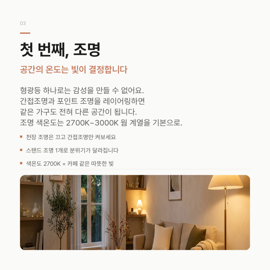 가장 먼저 해야 할 일은 차가운 천장 형광등을 끄고 간접 조명을 켜보는 것입니다.