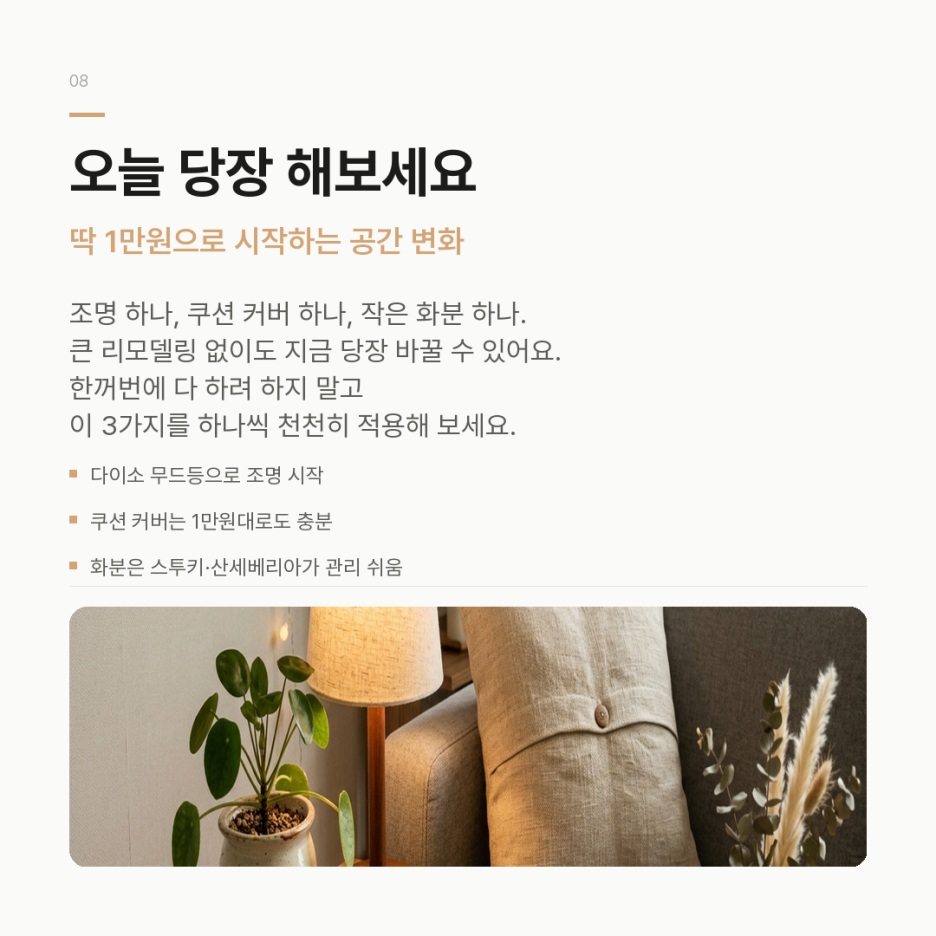조명 하나, 쿠션 커버 하나, 작은 화분(관리가 쉬운 스투키나 산세베리아) 하나.