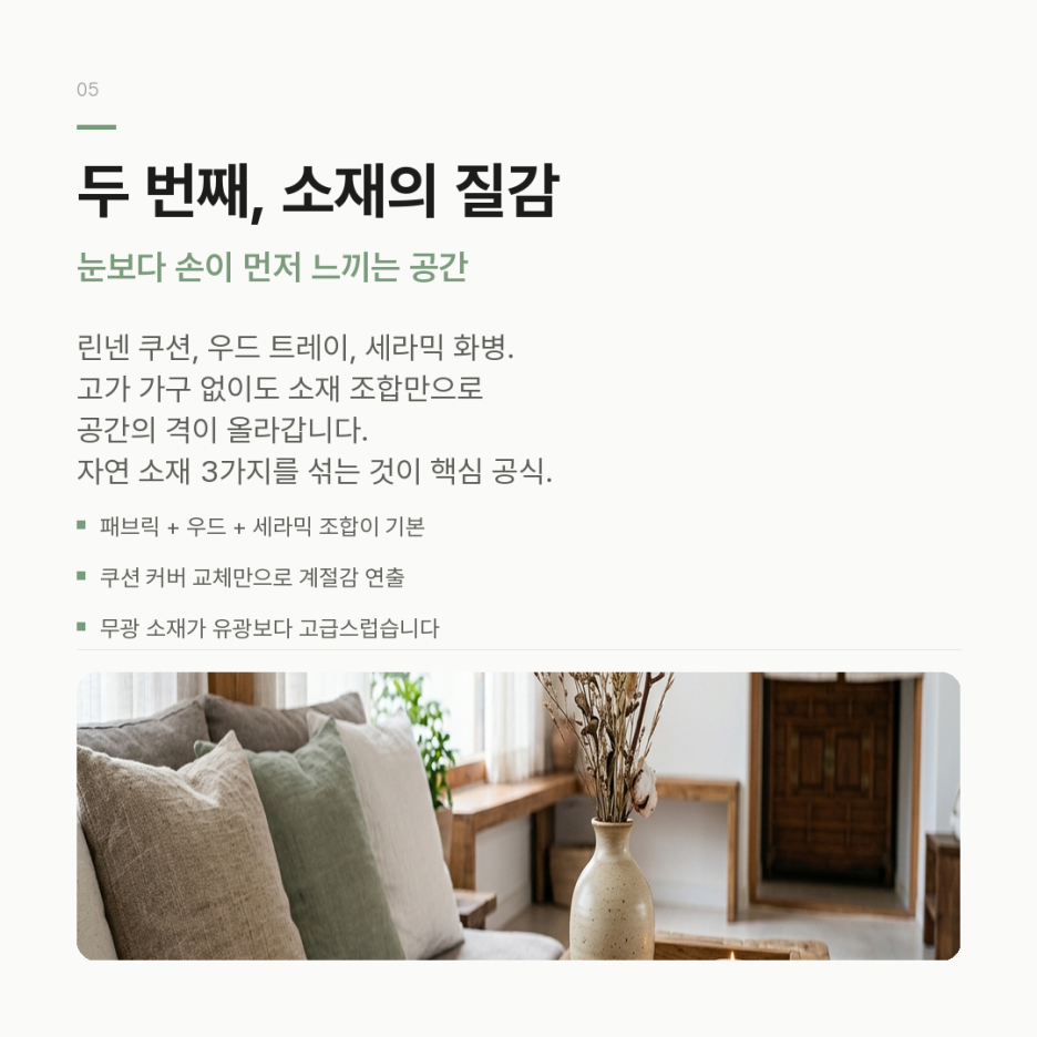 자연 소재인 '패브릭 + 우드 + 세라믹' 세 가지를 한 공간에 함께 두는 것이 실패 없는 핵심 공식입니다.