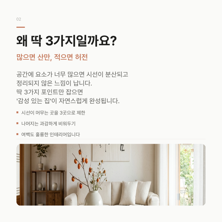 소품은 홀수(3개, 5개)로 배치하는 것이 시각적으로 가장 자연스러우며,