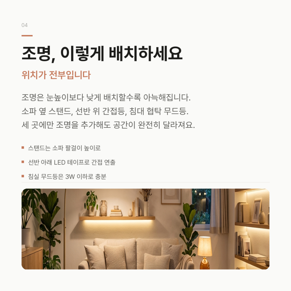 소파 팔걸이 높이의 스탠드, 선반 아래를 은은하게 비추는 LED 테이프, 3W 이하의 침실 무드등.
