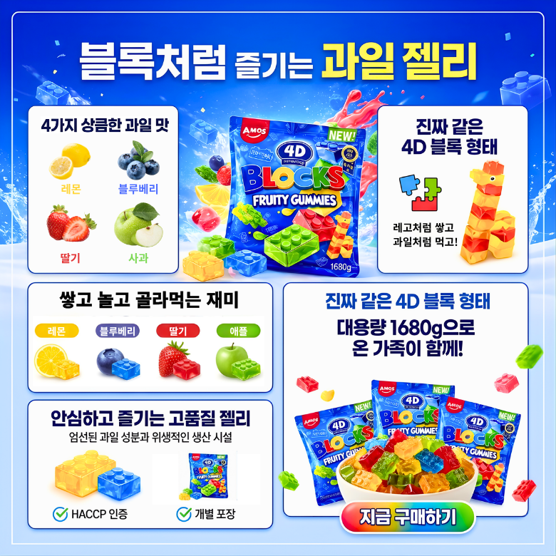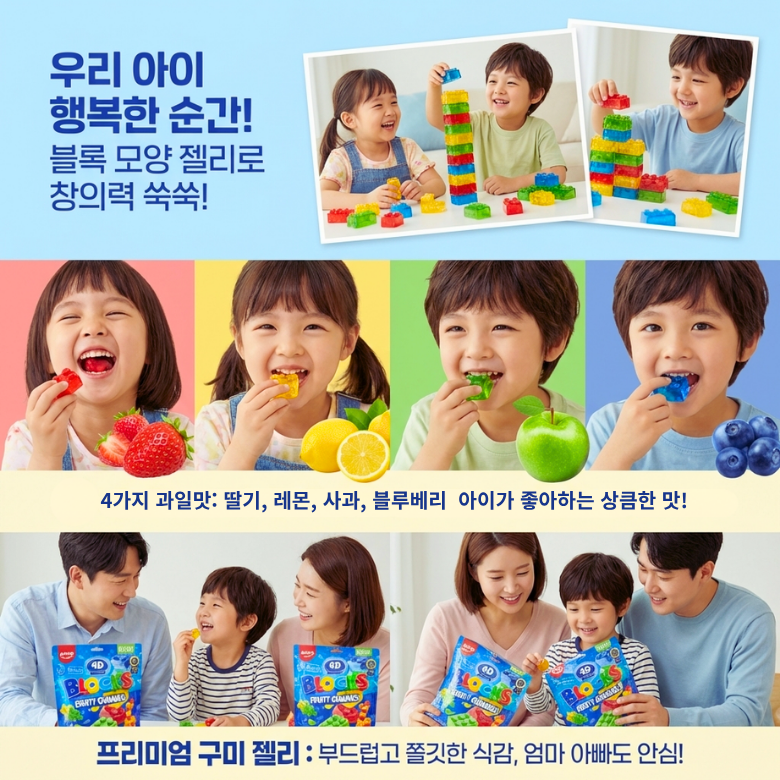 이 젤리의 가장 큰 특징인 '레고처럼 쌓고 노는 재미'와 '리얼 과즙의 상큼함'을