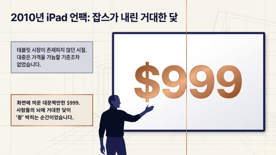 2010년 아이패드를 처음 세상에 공개할 때, 잡스는 화면에 대문짝만하게 $999라는 숫자를 띄웁니다.