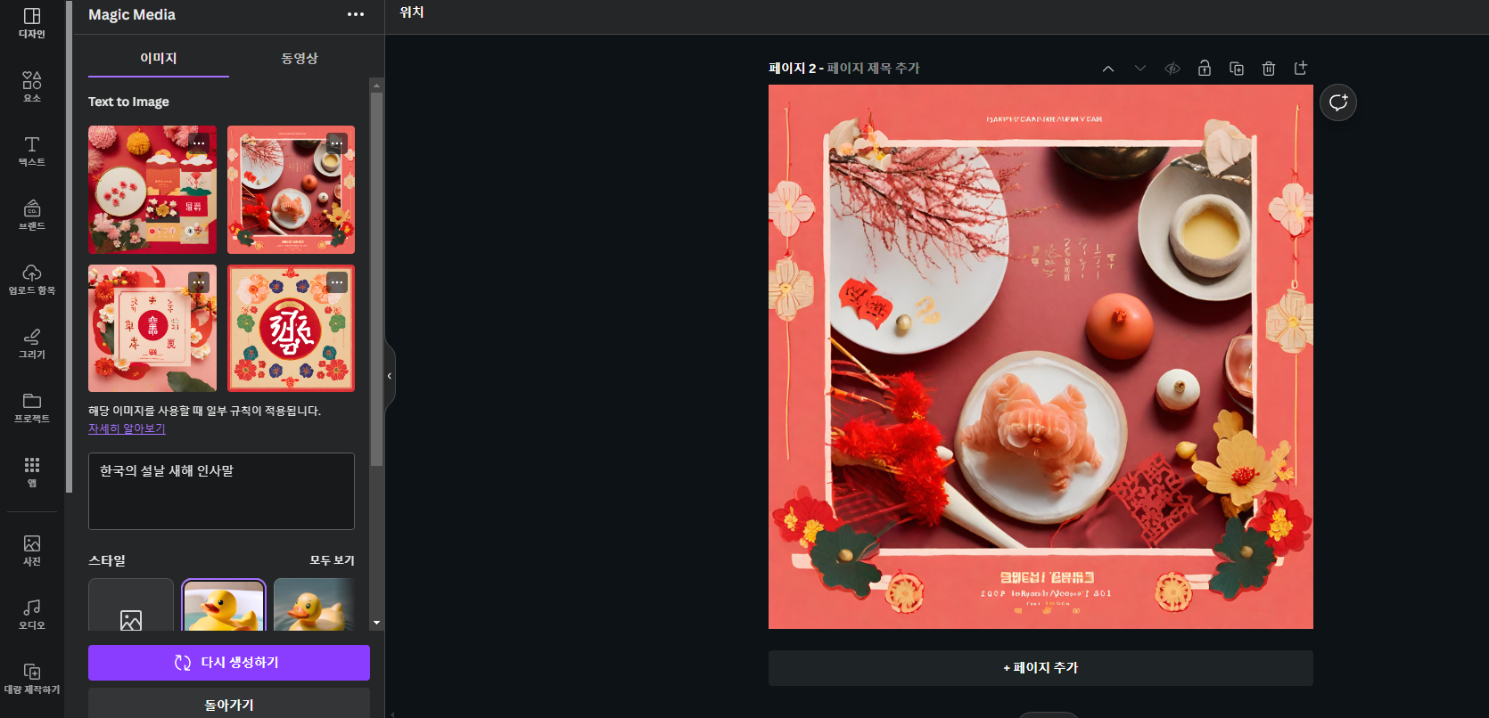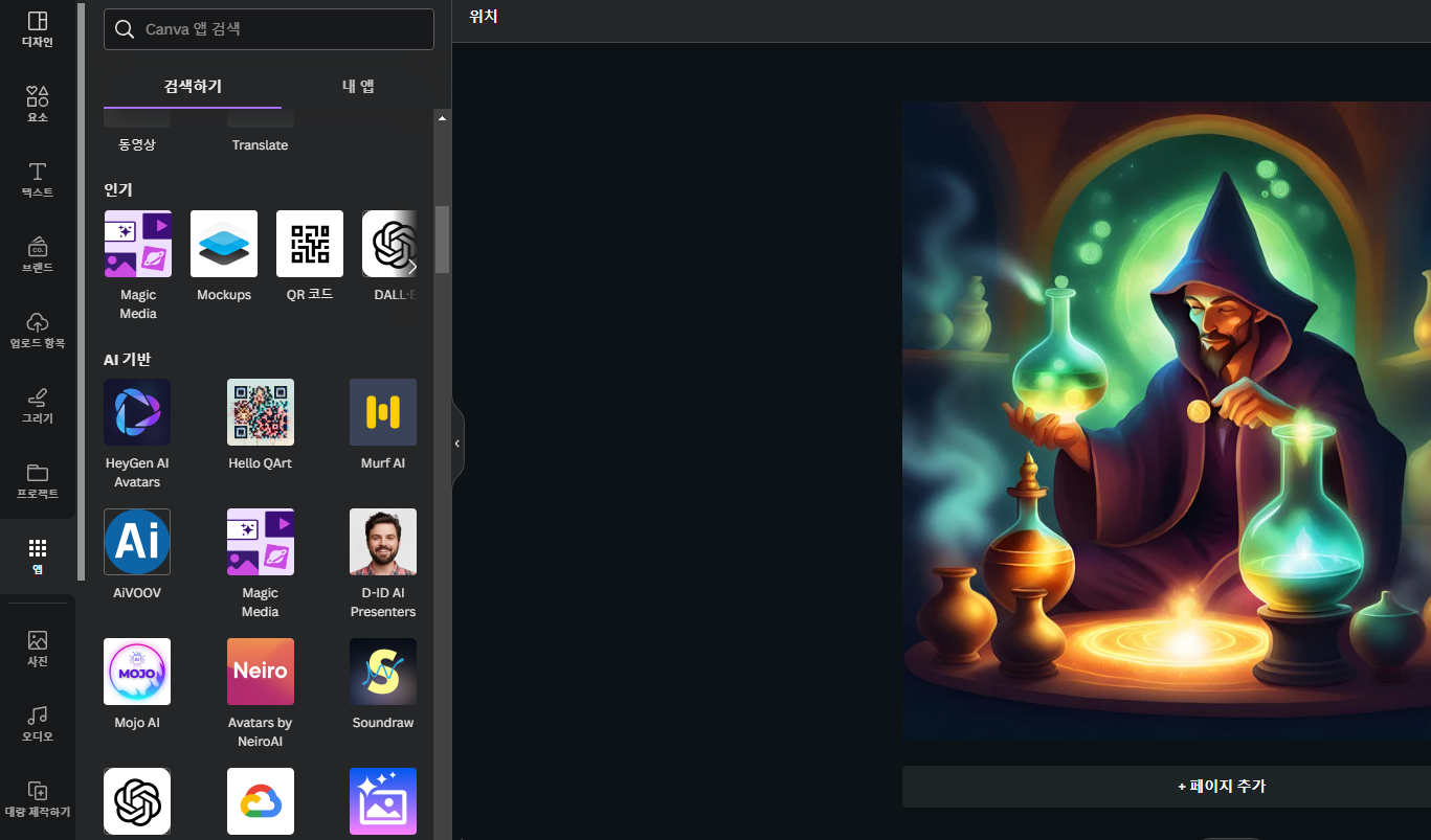칸바는 디자인과 동시에 이미지 생성 AI와 동영상 생성, 편집, 부가 보조기능의 AI가 탑재되어있습니다.