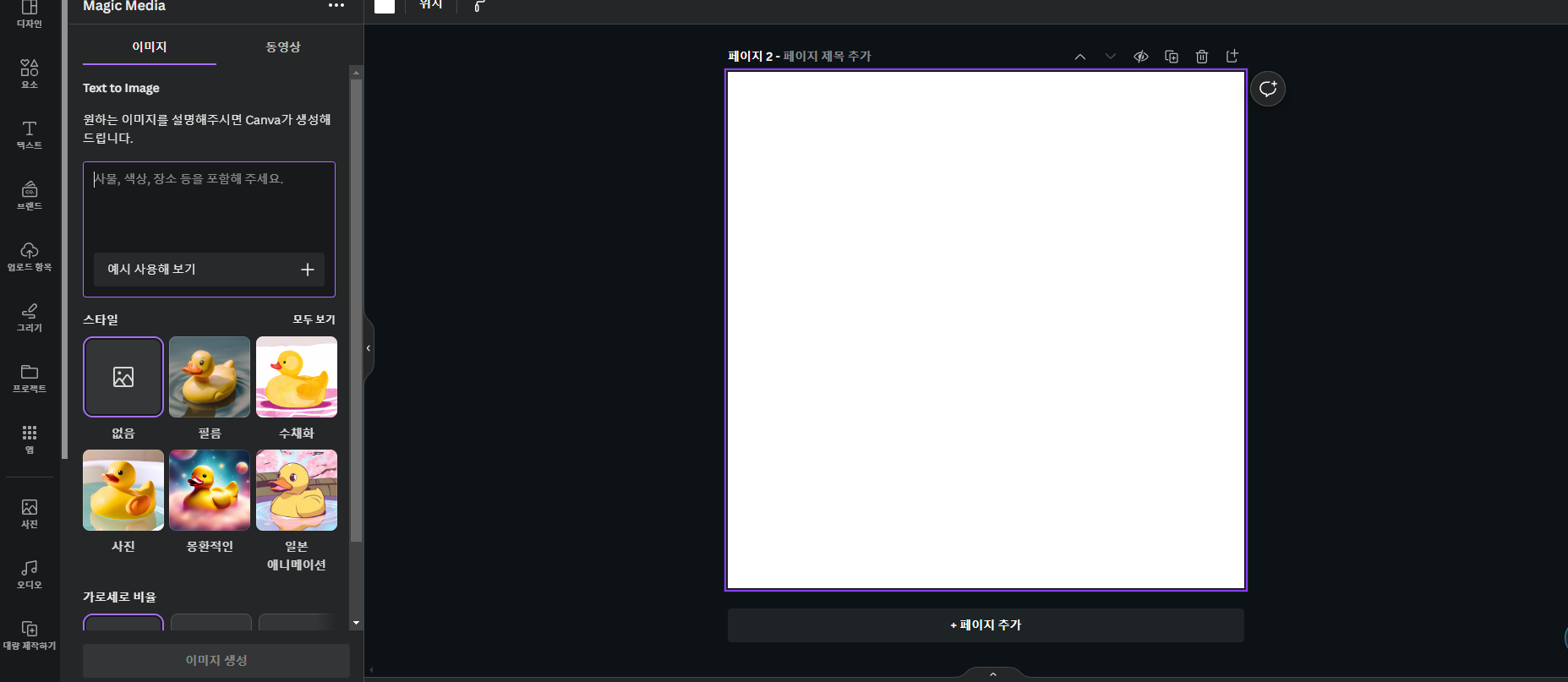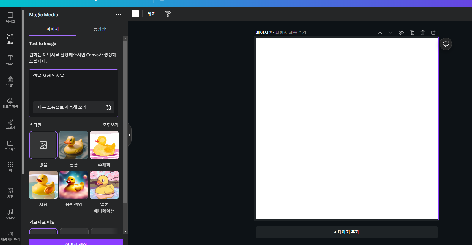 프롬프트를 입력하고 밑에 스타일과 비율을 클릭하고 기다려주시면 이미지가 완성됩니다.