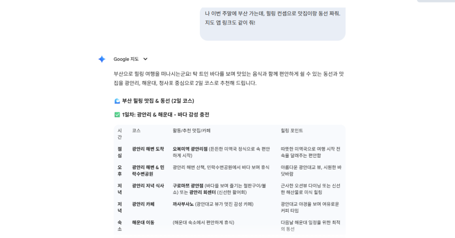 ✈️ 여행 계획 짜기: "나 이번 주말에 부산 가는데, 힐링 컨셉으로 맛집이랑 동선 짜줘.