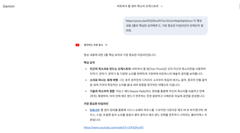 Gemini 3는 유튜브 영상 링크나 파일을 주면, 직접 영상을 보고 내용을 요약해 줍니다.