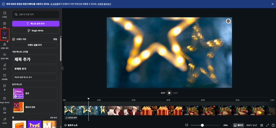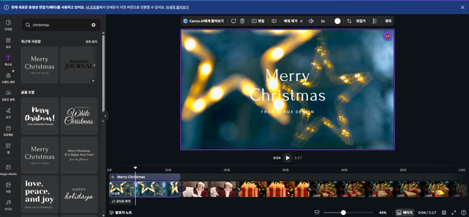 저는 "Merry Christmas"라고 적고, 영상 분위기에 맞는 세련된 폰트로 바꿨어요.
