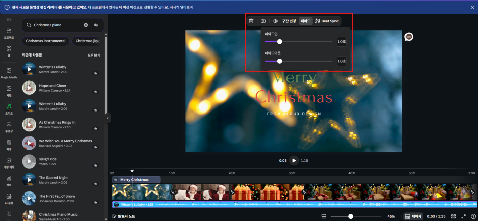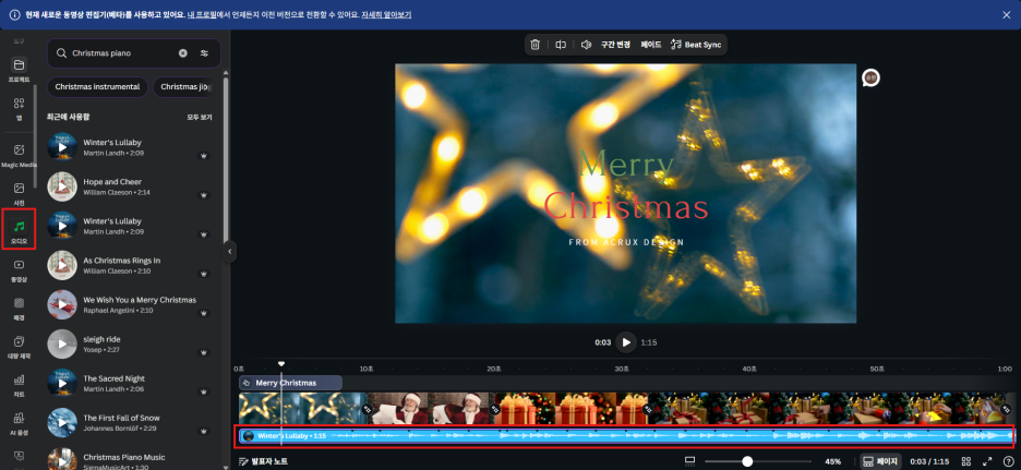 저는 'Winter's Lullaby'라는 잔잔한 곡을 선택해서 타임라인 아래에 드래그해 넣었습니다.