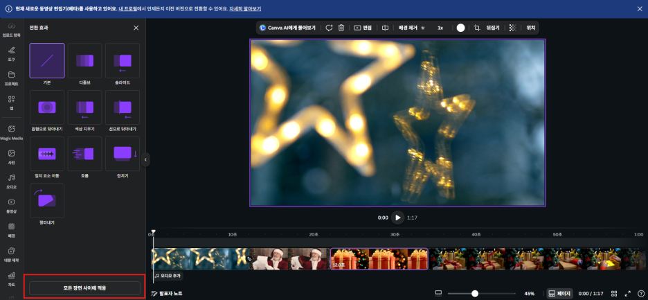 매번 설정하기 귀찮다면? 하단에 있는 [모든 장면 사이에 적용] 버튼을 꾹 눌러주세요. 한 번에 해결! 😎