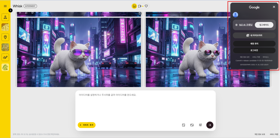 이미지 생성 (Whisk): 이미지 생성은 무료입니다. 크레딧이 소모되지 않습니다.