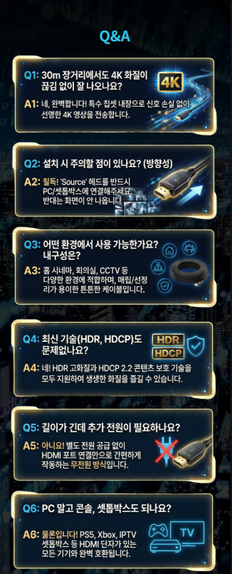 "내 컴퓨터랑 TV에 연결했을 때 끊기지 않을까?", "30m나 되는데 화질 저하가 없을까?"