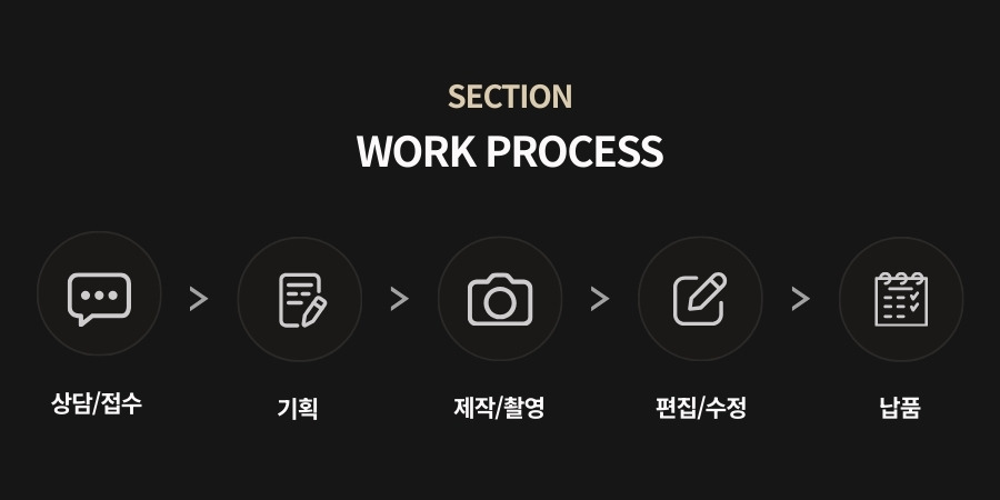 [Work Process] 상담/접수 > 기획 > 제작/촬영 > 편집/수정 > 납품